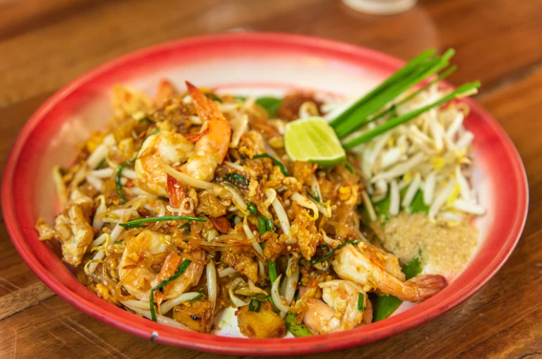 - Pad Thai: Stir-fried rice noodles tossed with tamarind sauce, egg, tofu, and your choice of prawns or chicken, finished with bean sprouts, garlic chives, a sprinkle of crushed peanuts and a squeeze of lime. This iconic dish hits the sweet-sour balance Thai food is loved for.