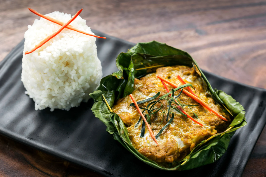 - Fish Amok: Cambodiaâs most famous dish â a silky, custard-like fish curry steamed in banana leaves. Chunks of freshwater fish (like catfish or barramundi) are gently cooked in a blend of coconut milk, kroeung (a spice paste of lemongrass, galangal, turmeric, garlic, and shallots), and chili, along with egg that thickens it to a mousse texture. Itâs served in a banana-leaf cup, often topped with coconut cream and strips of kaffir lime leaf. The result is delicately fragrant (not overly spicy) and utterly unique â a must-try for anyone curious about Khmer cuisine.